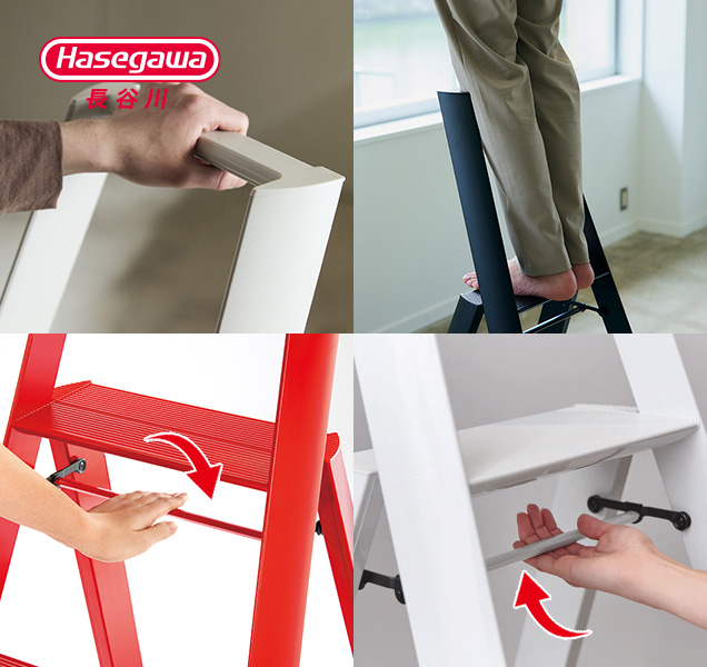 踏板及天板带有防滑纹路设计,脚垫为柔软的PVC树脂材料,确保登高安全