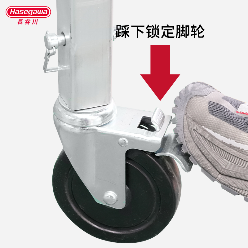 带有脚刹的脚轮,易于推拉移动,方便快捷,移动时四脚协同,转向精准,作业时锁定脚轮,稳稳当当